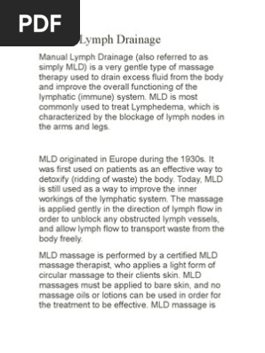 Manual lymph drainage mld is a treatment option applied directly to the lymphatic system. The goal of lymphatic drainage in the massage is to increase the flow of lymph and reduce toxins in the body. Fedele department of functional and applied anatomy hannover medical school oe 4120 carlneubergstr1 30625 hannover germany. Lymphatic massage also called lymphatic drainage or manual lymph drainage is a technique developed in germany for treatment of lymphedema an accumulation of fluid that can occur after lymph nodes are removed during surgery.